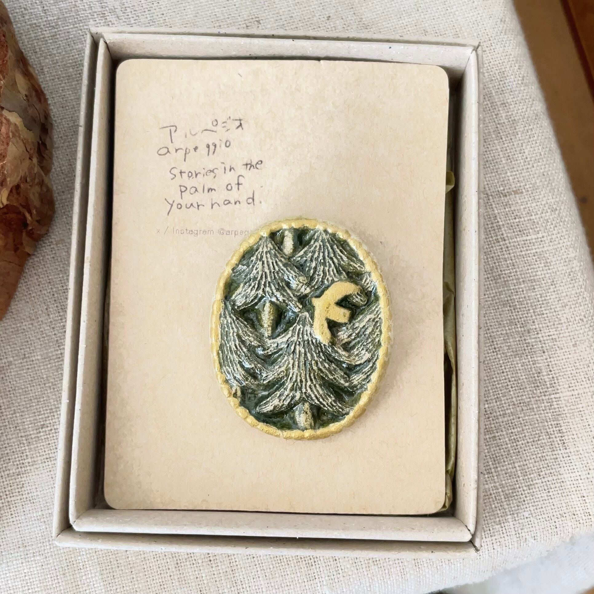 深く静かな森の景色を切り取って額縁に閉じ込めたような形をイメージしたブローチ。