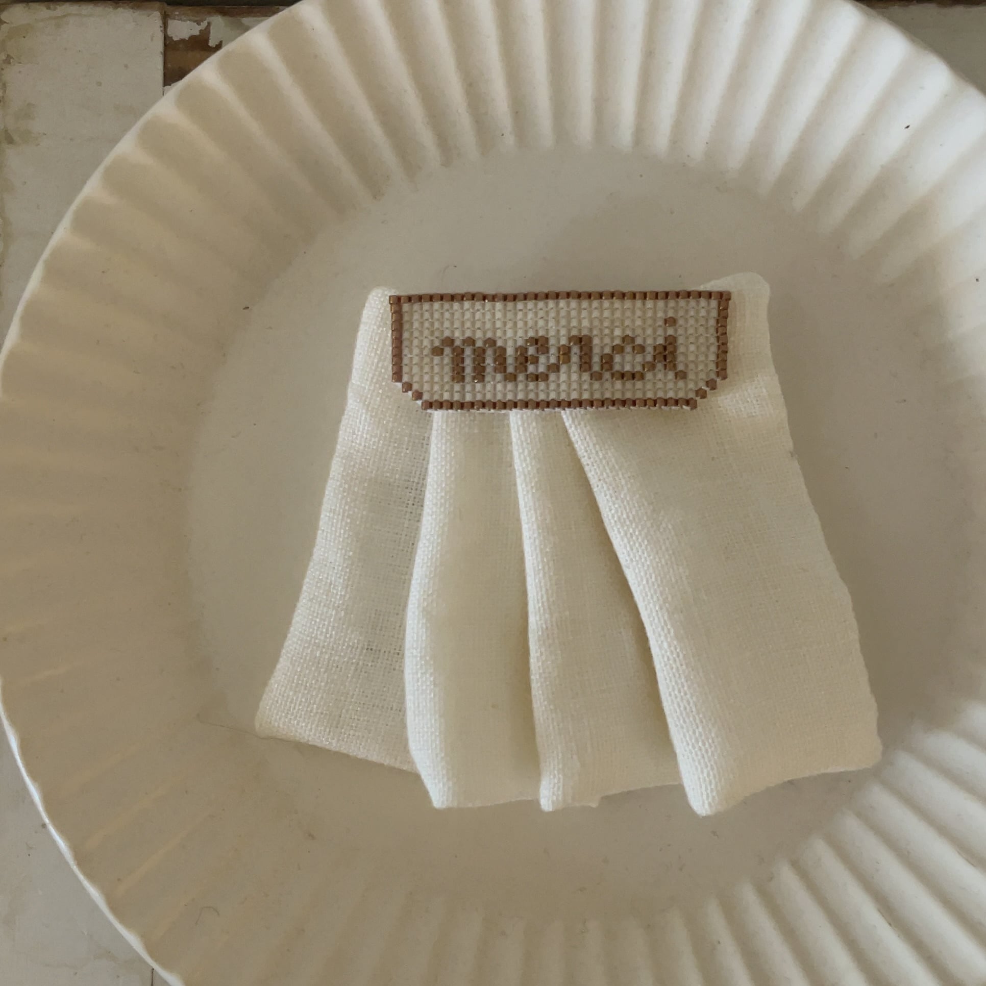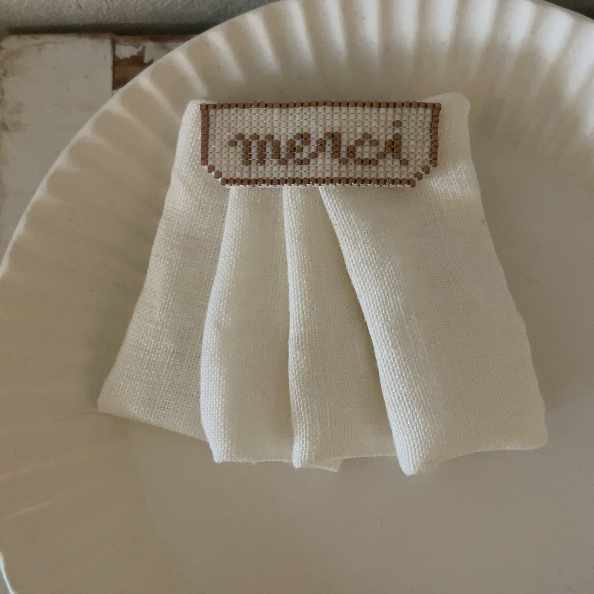 箔の入ったアイボリーのビーズを使いステッチ技法で文字を刺しています