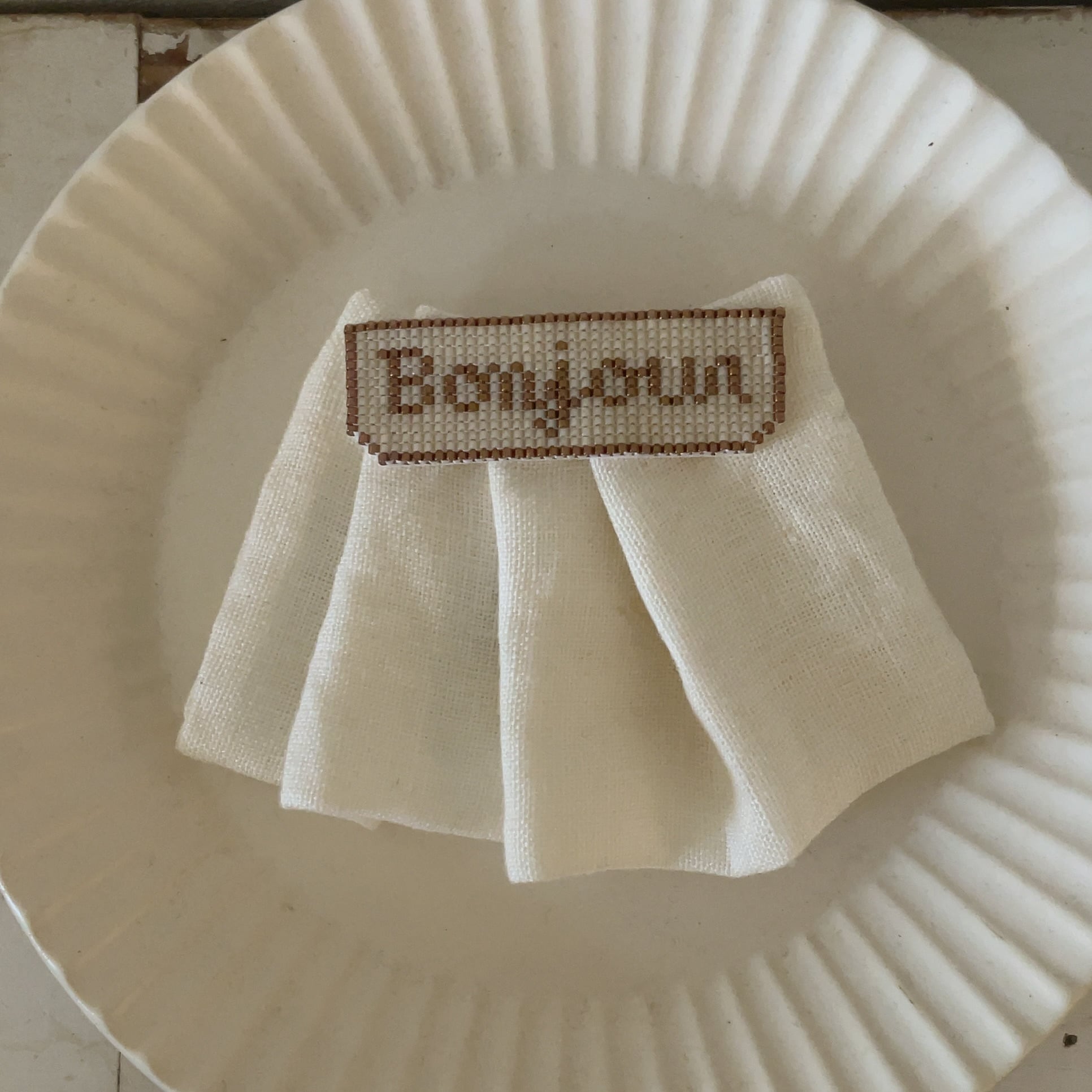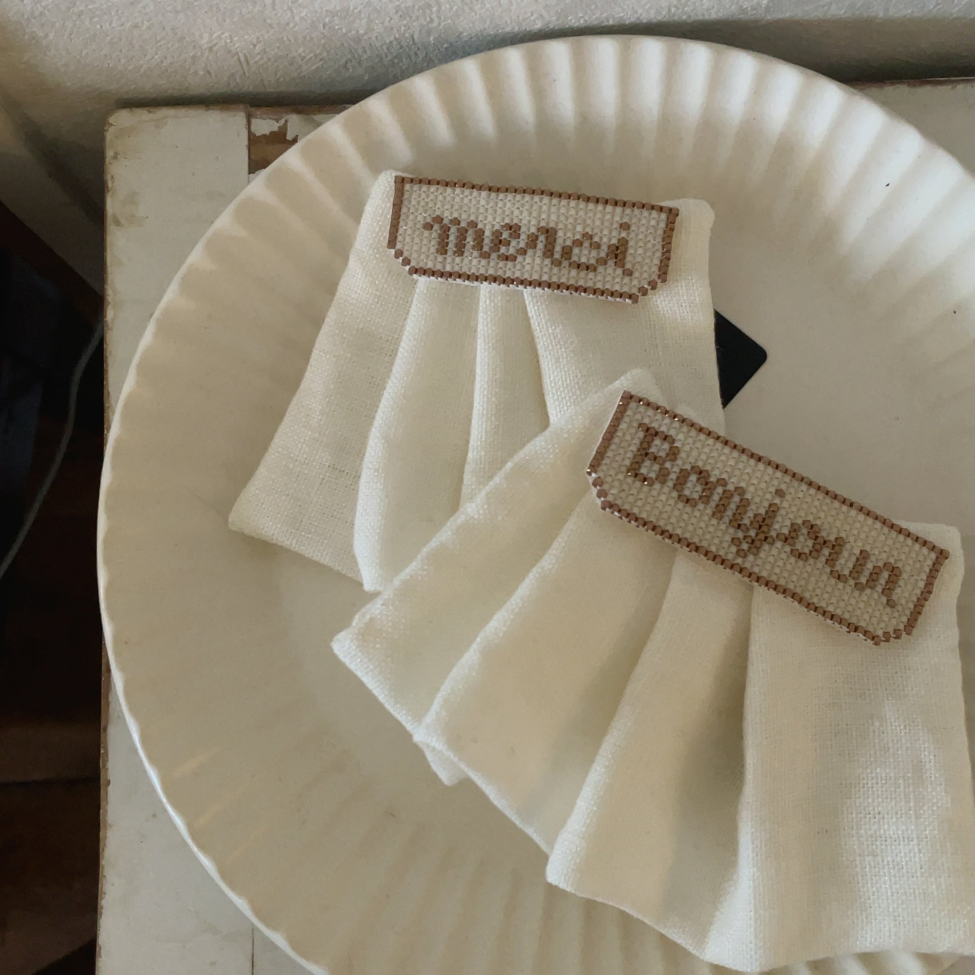 箔の入ったアイボリーのビーズを使いステッチ技法で文字を刺しています