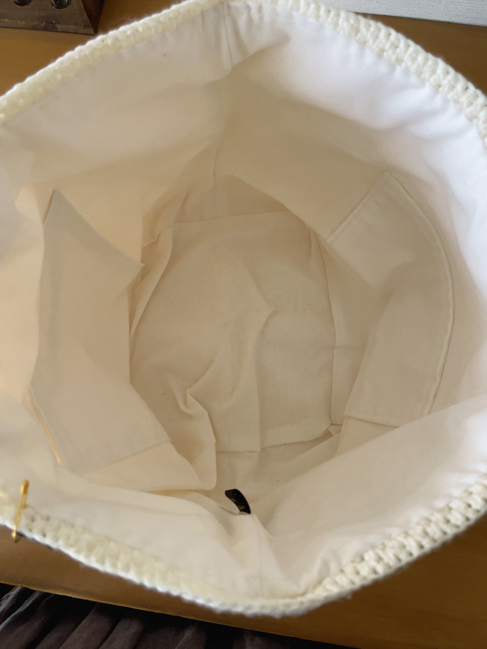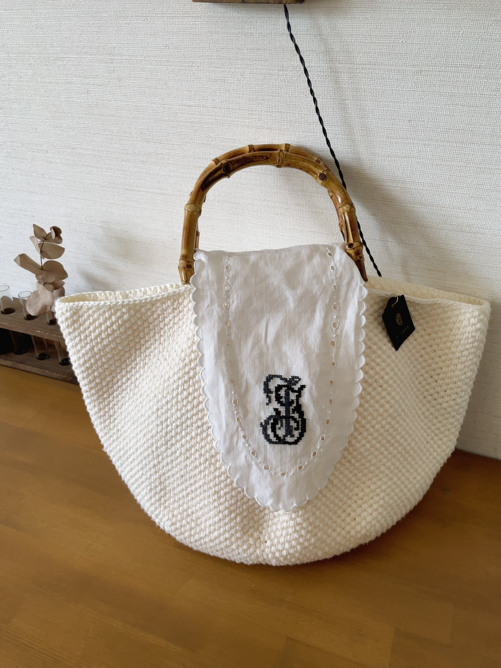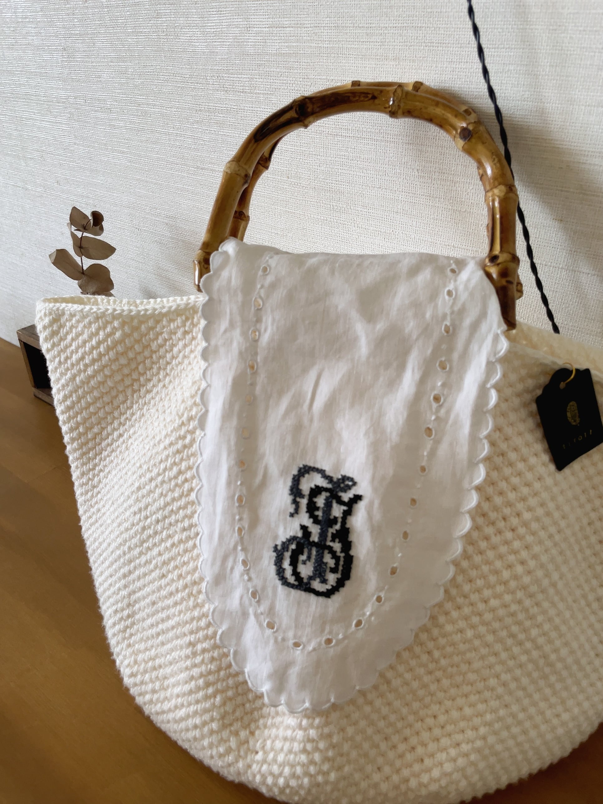 ヴィンテージのクロスにイニシャル刺繍が可愛いニットバッグ