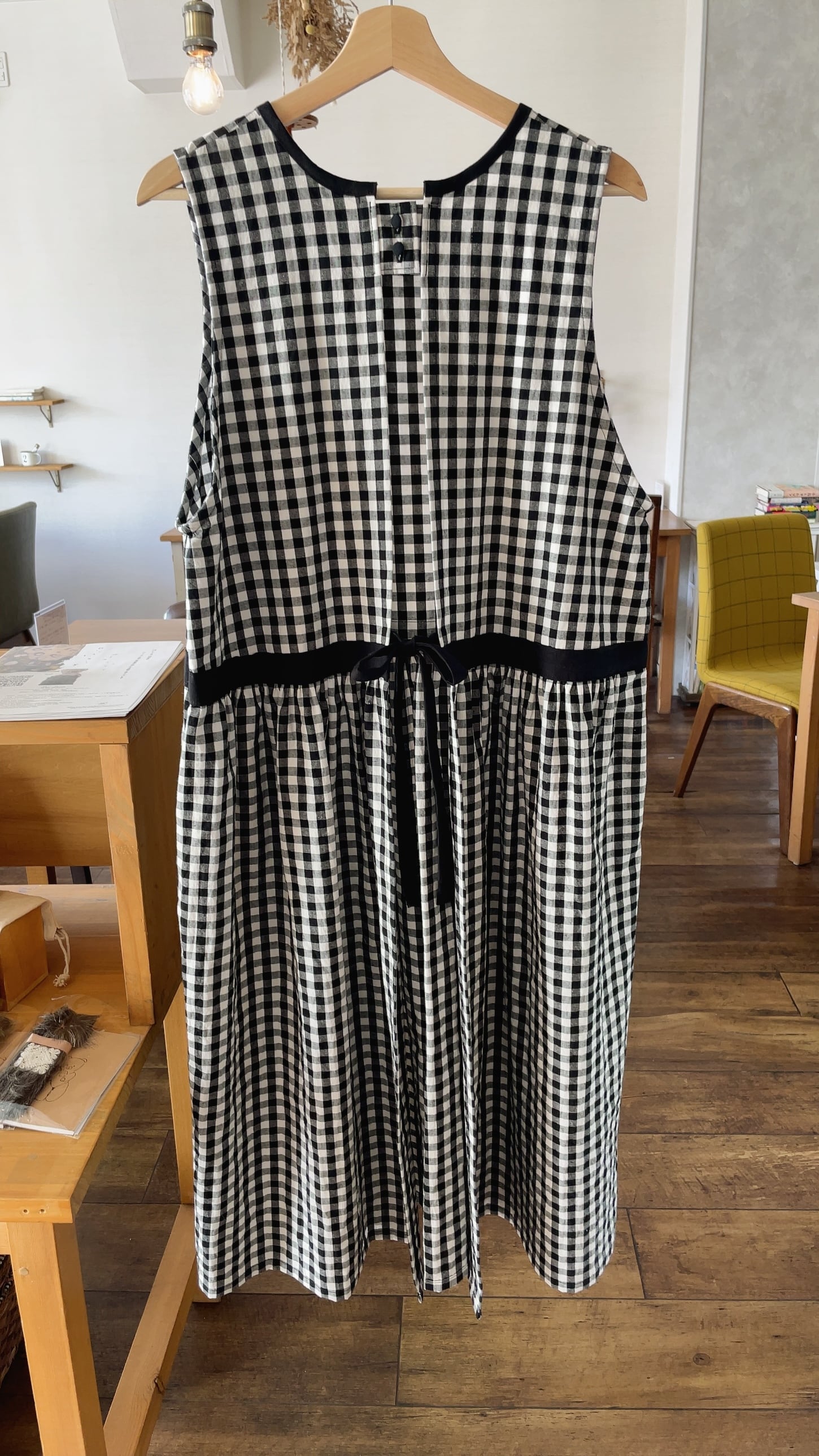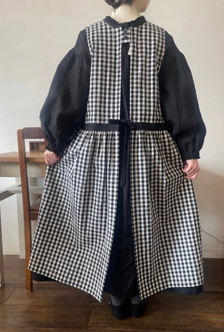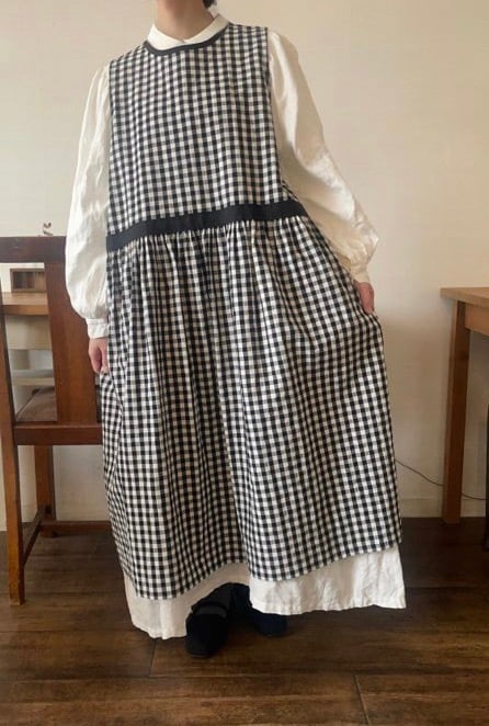 大きめのギンガムチェックが特徴のエプロンワンピース