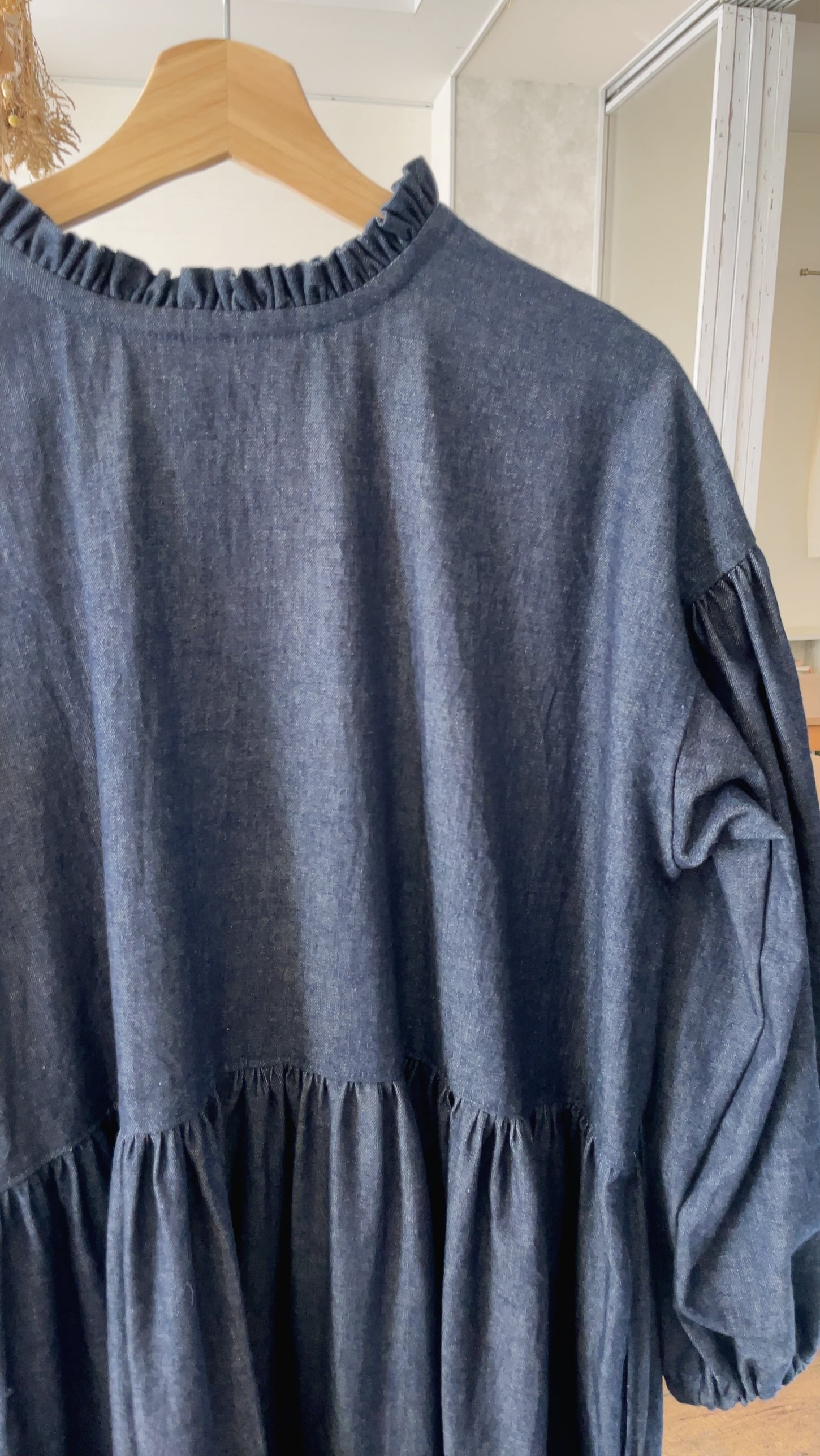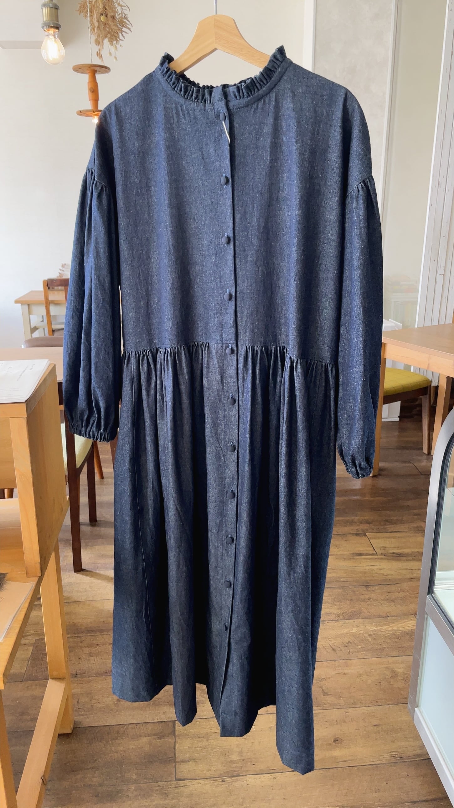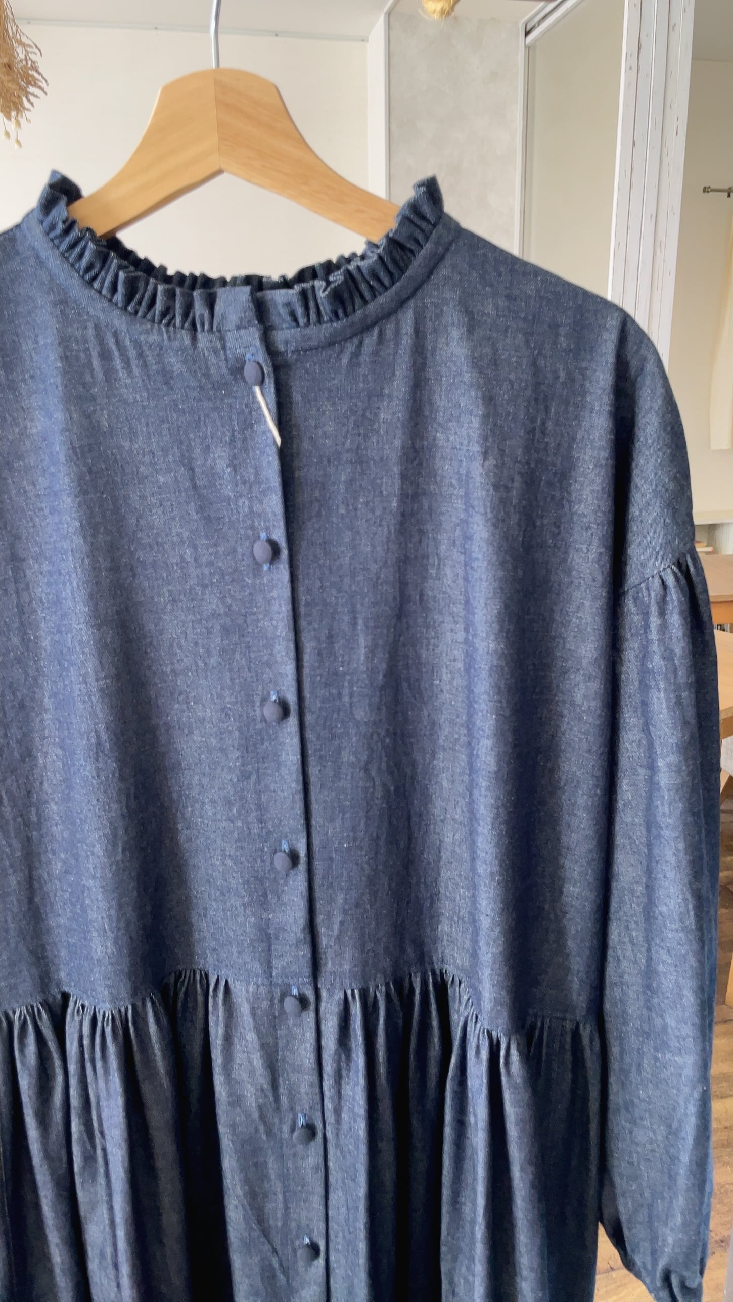 デニム地のフリル襟ワンピース
