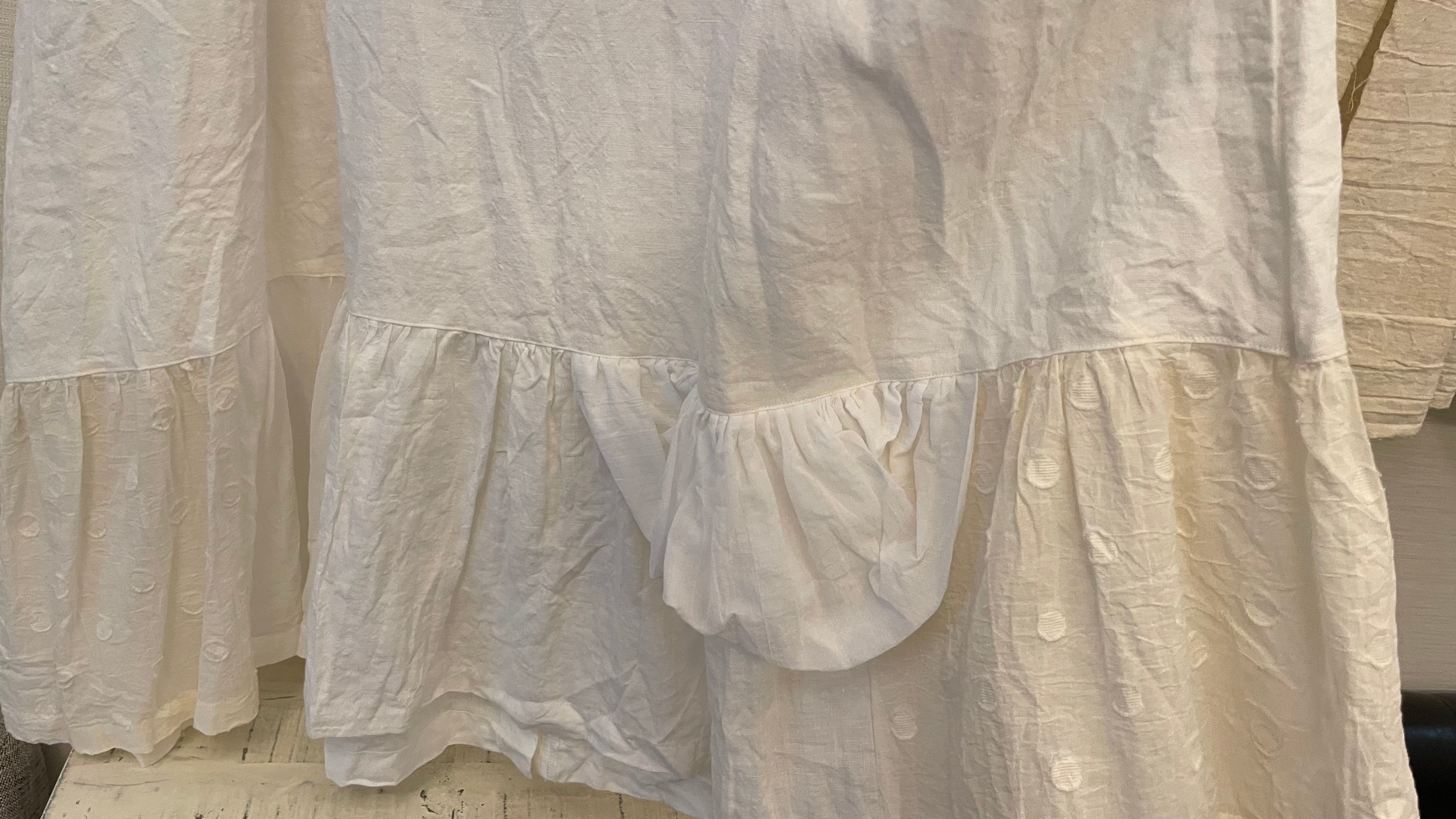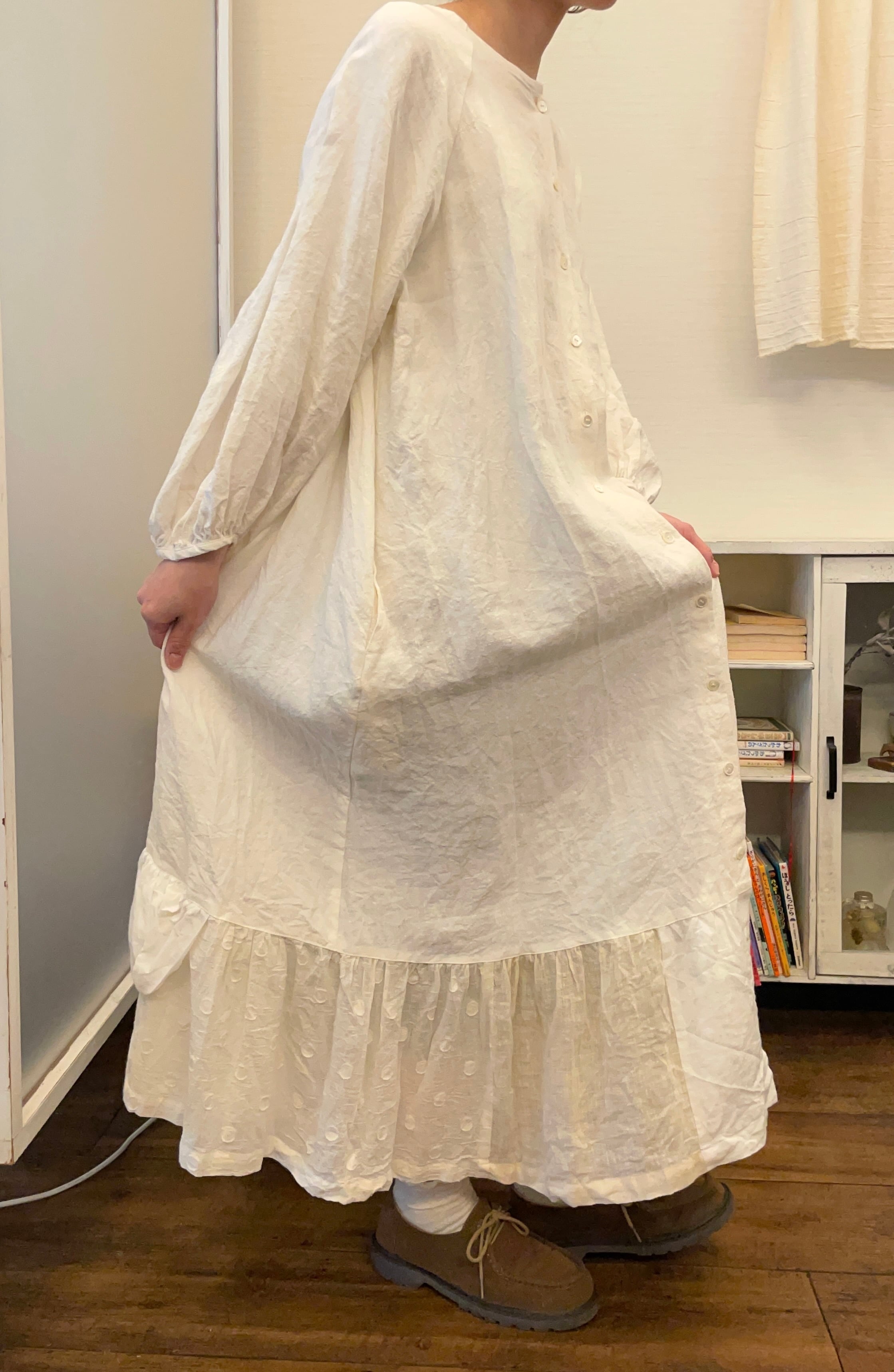 別生地をつなぎあわせた、あそび心いっぱいの裾フリル。