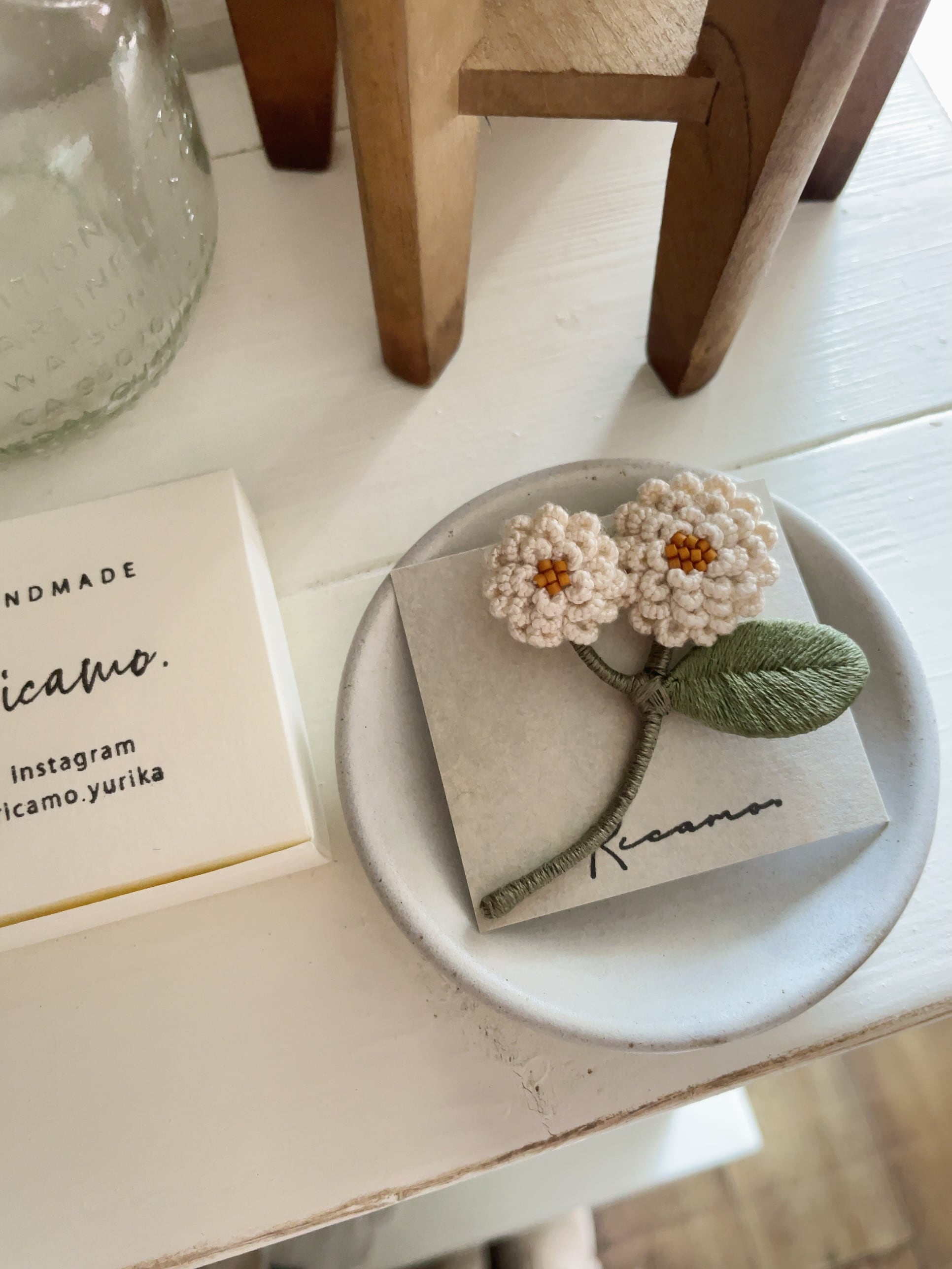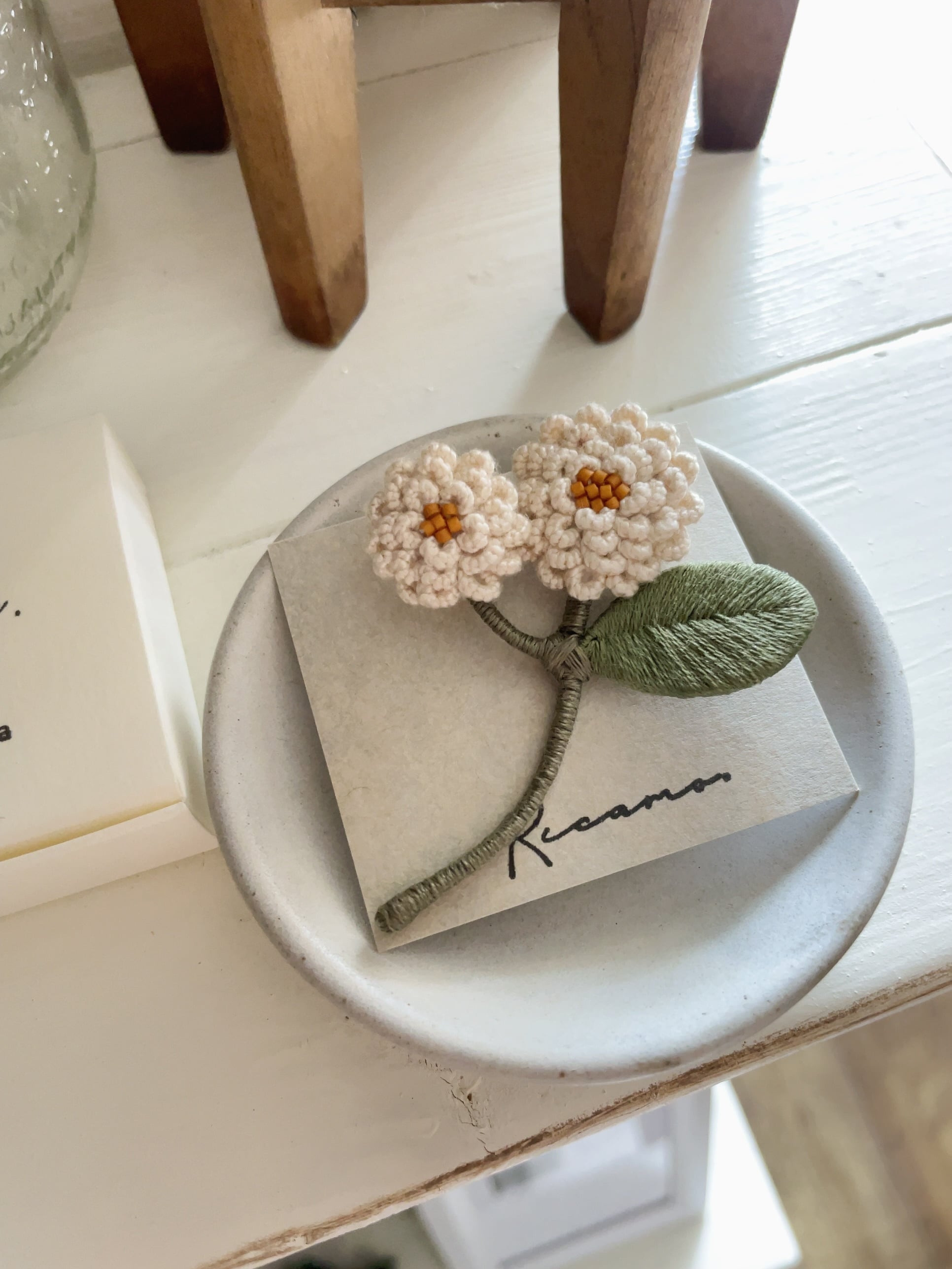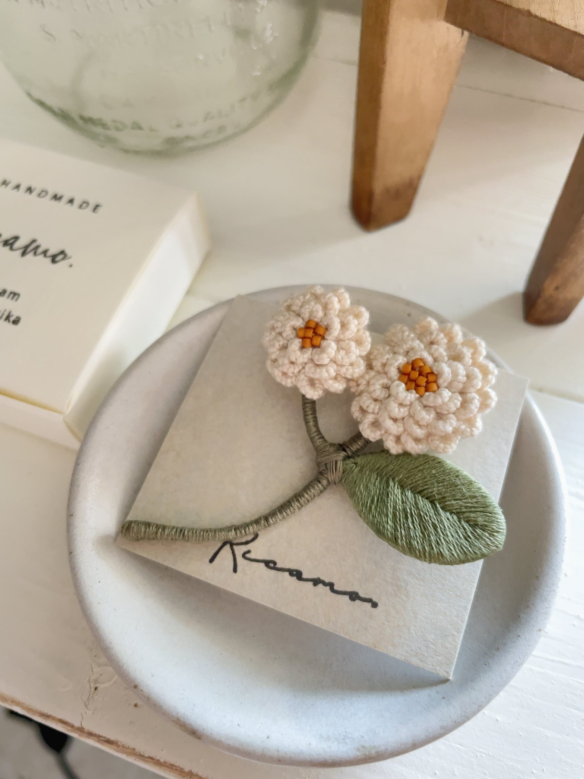 riCamo./お花ブローチ 花びら一枚一枚、立体的になるよう手刺繍された お花のブローチ 春のお洋服の胸元を華やかに飾ってくれる一品です。 お洋服の他にも、バッグや帽子のアクセントとしても◎ サイズ:約6cm×5cm