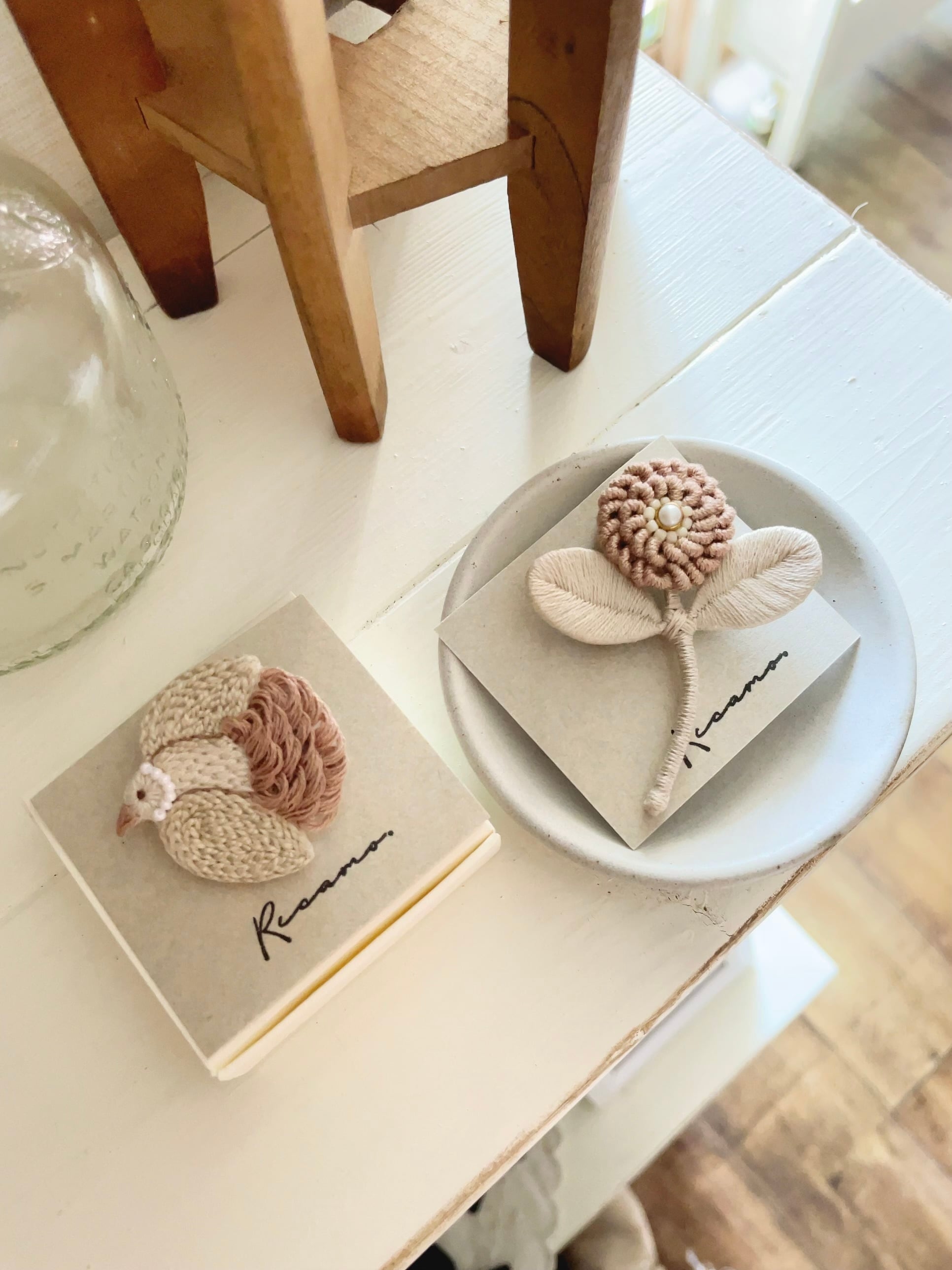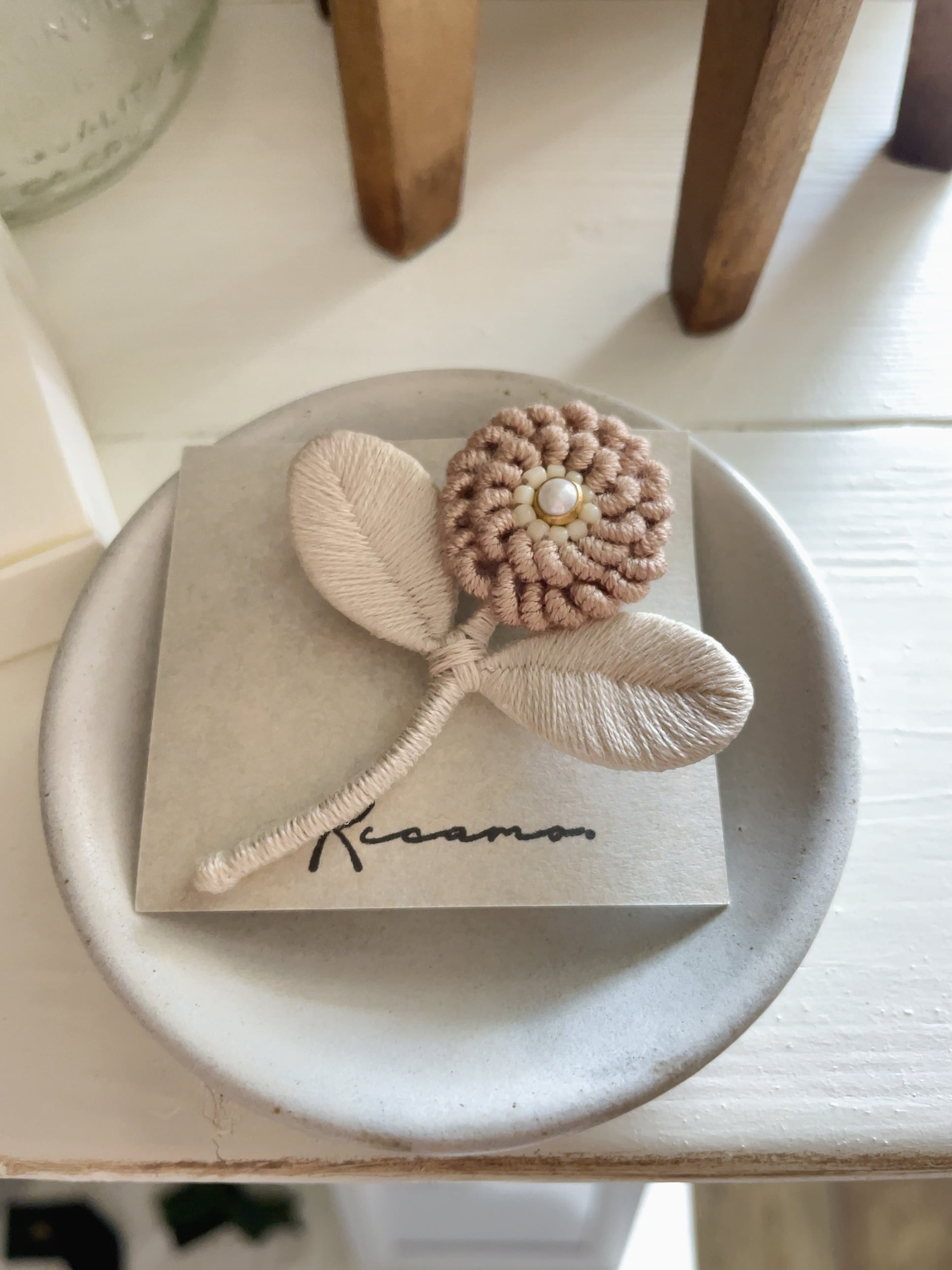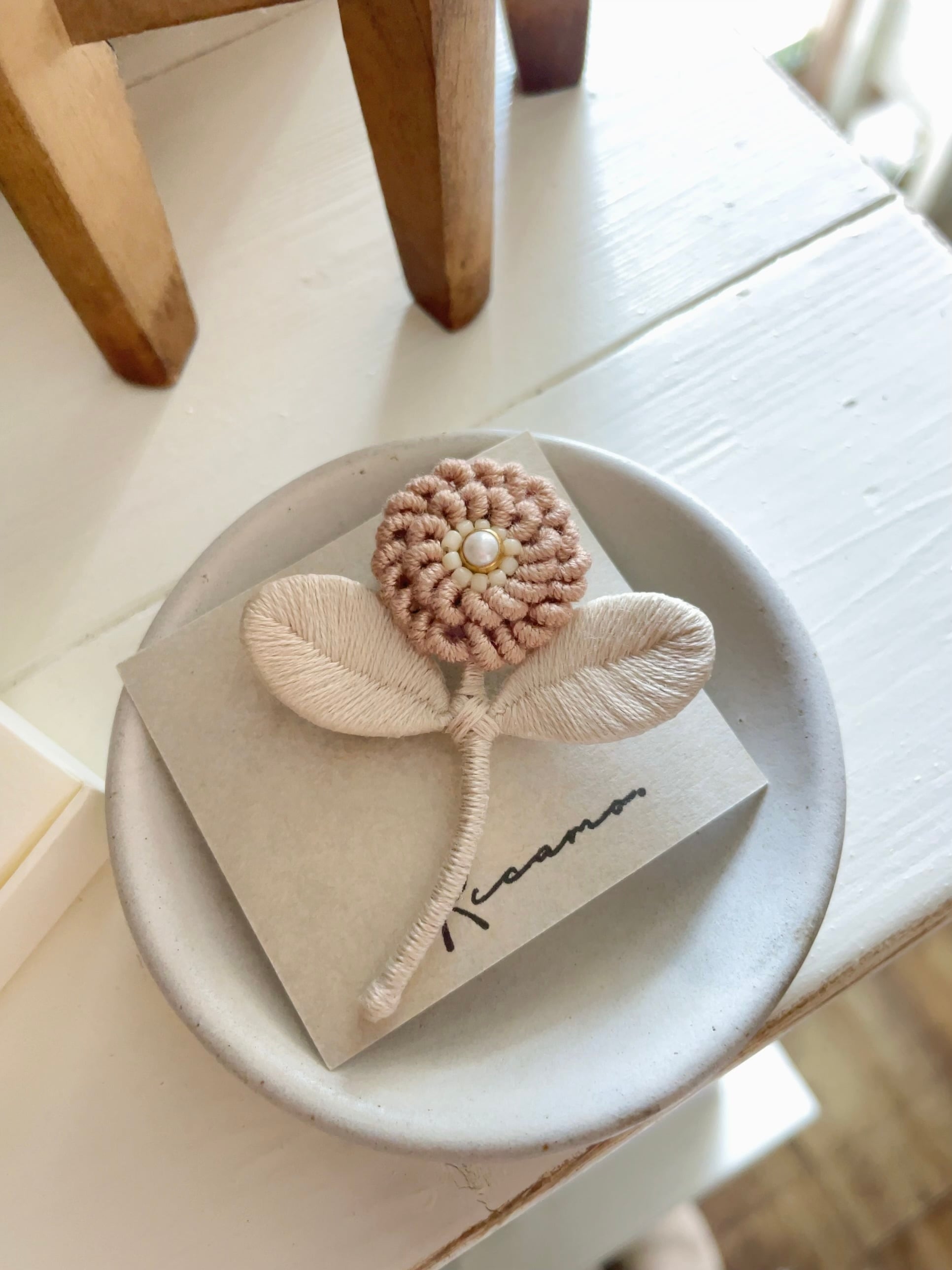 riCamo./お花ブローチ 花びら一枚一枚、立体的になるよう手刺繍された お花のブローチ 春のお洋服の胸元を華やかに飾ってくれる一品です。 ふんわりとし桜色が普段使いにはもちろんのこと、 オケージョンスタイルにも華を添えてくれそうですね* サイズ:約6cm×5cm