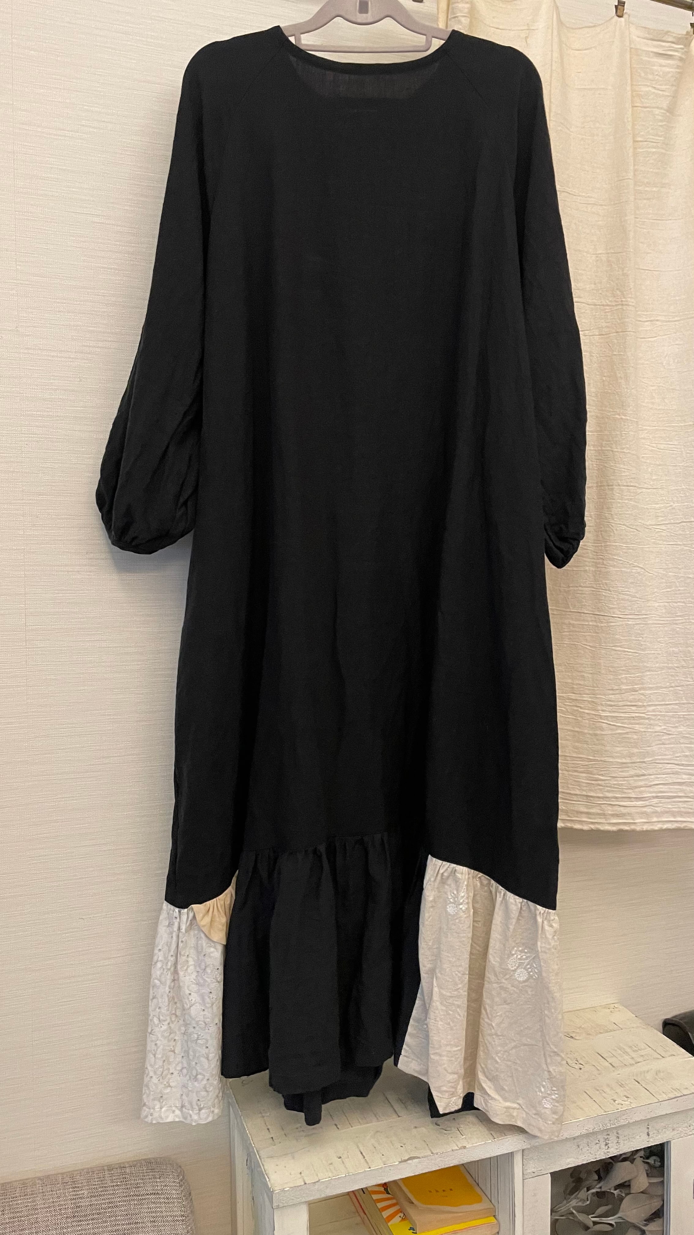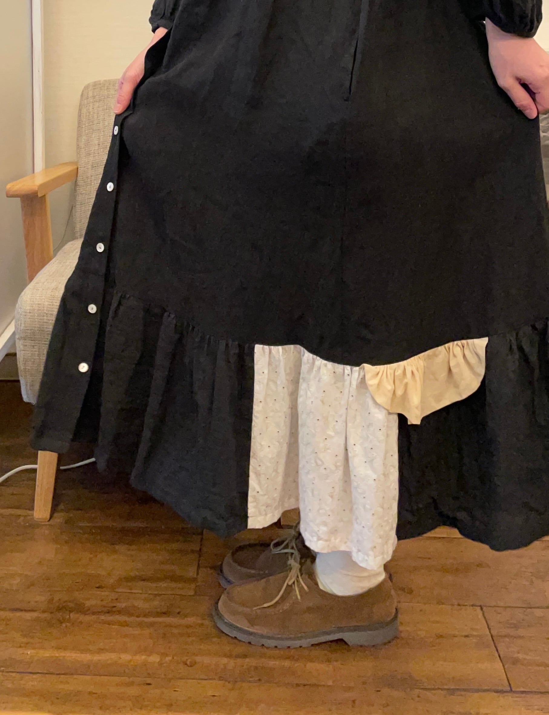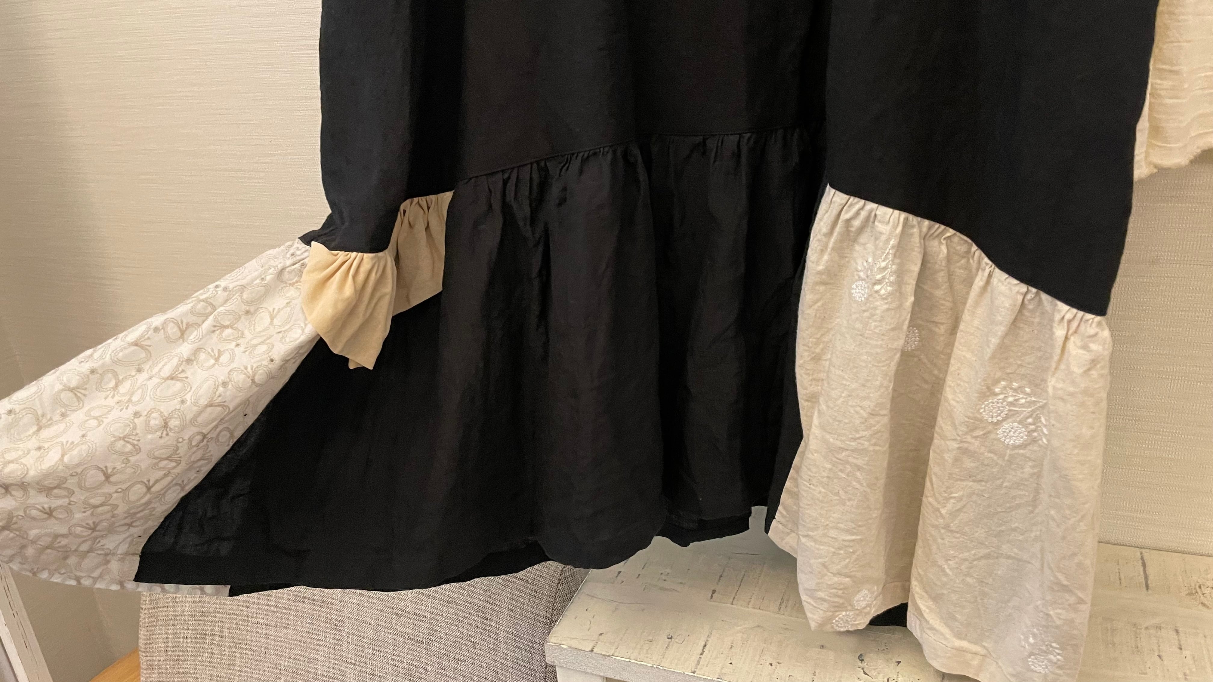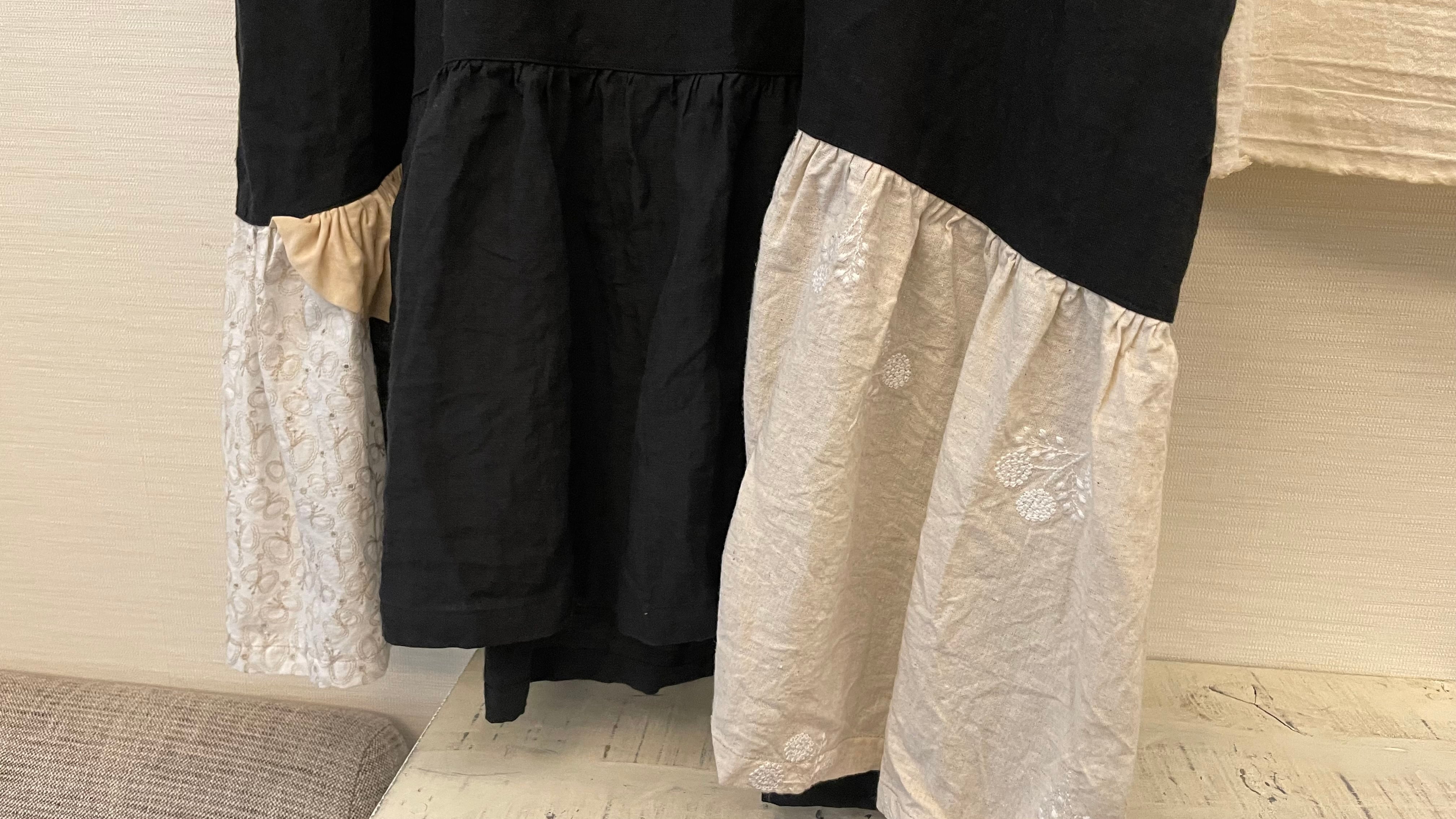 別生地をつなぎあわせた、あそび心いっぱいの裾フリル。