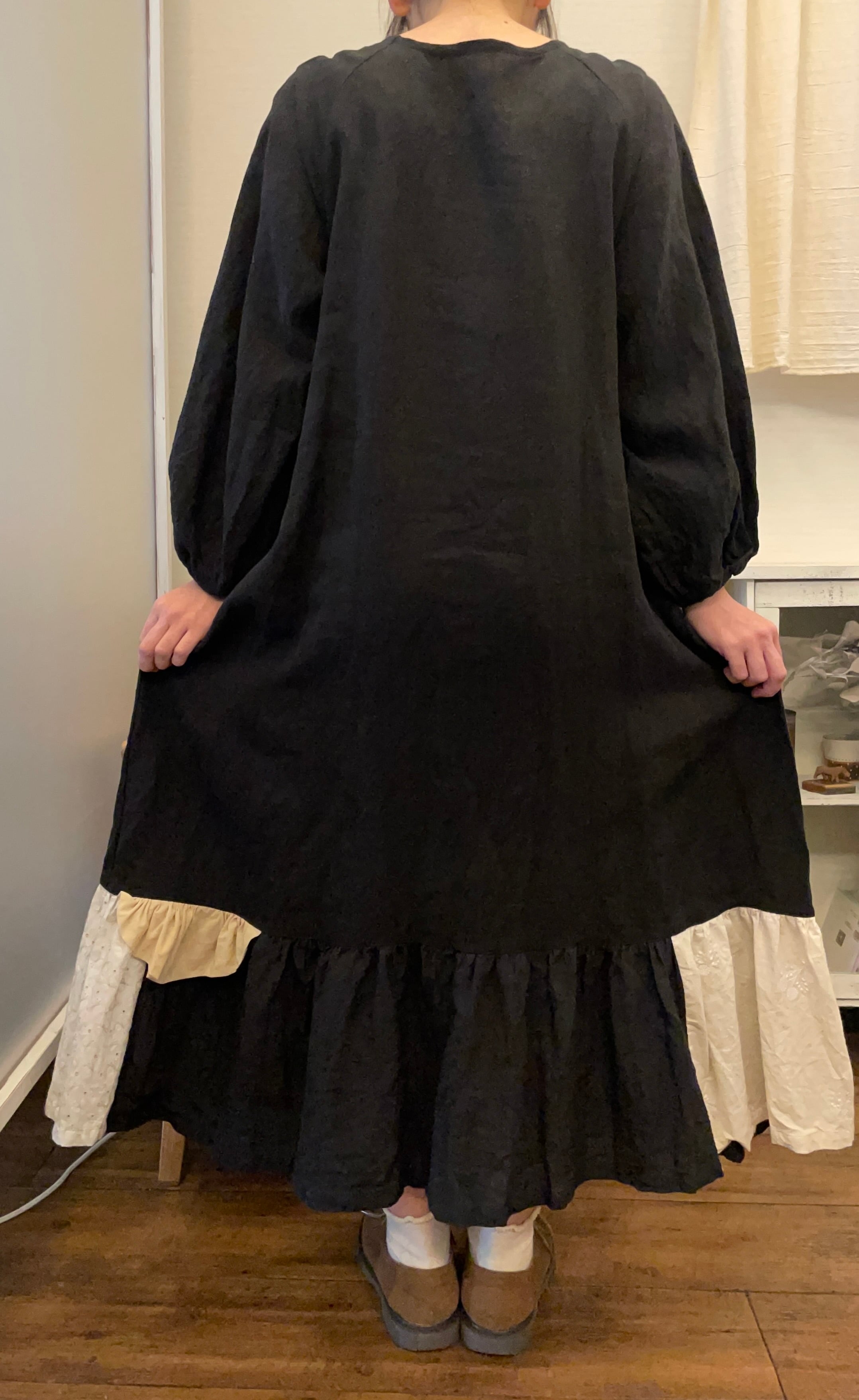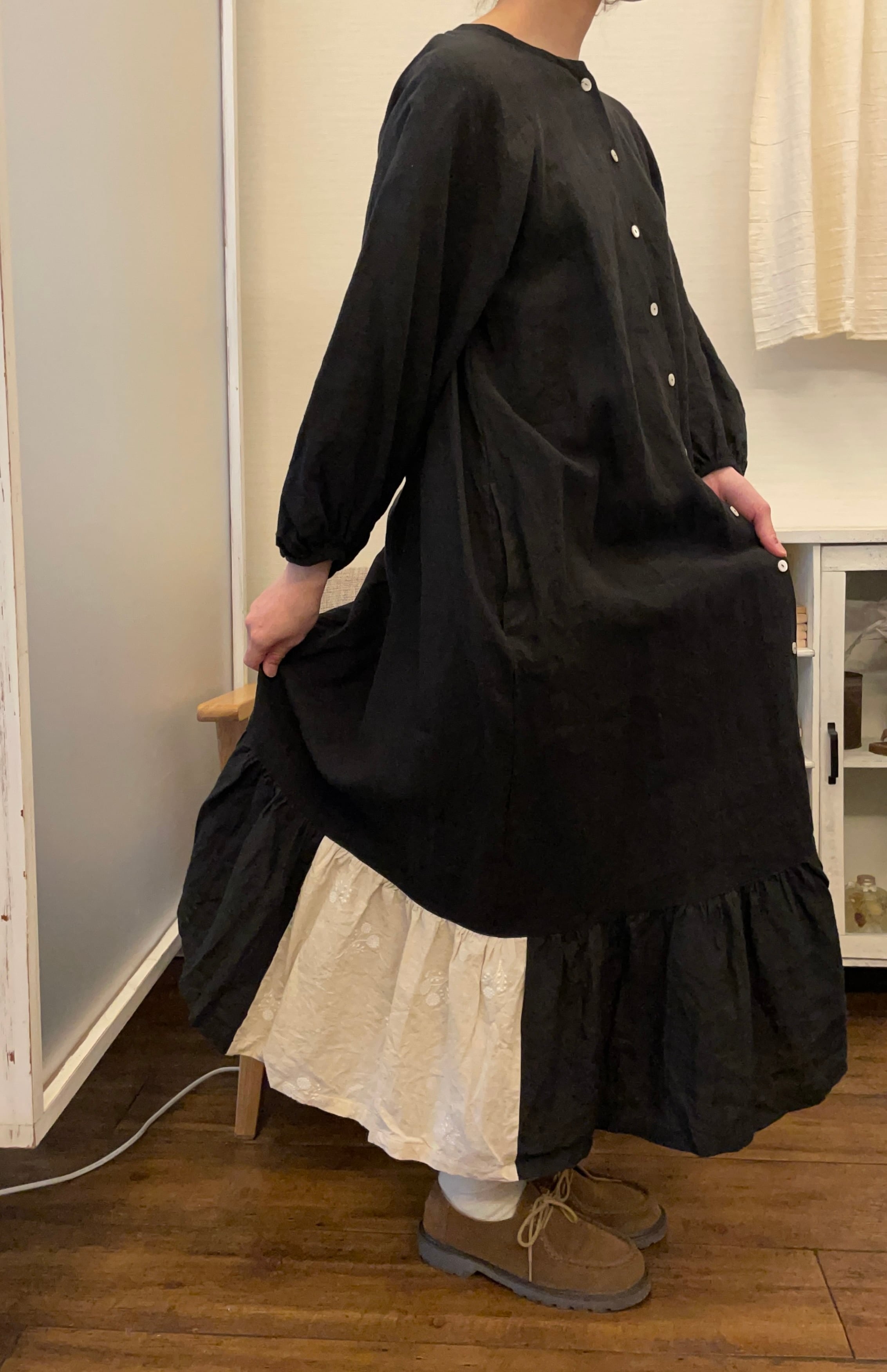 中厚のベルギーリネンで、ボタンを開けて羽織にしても◎